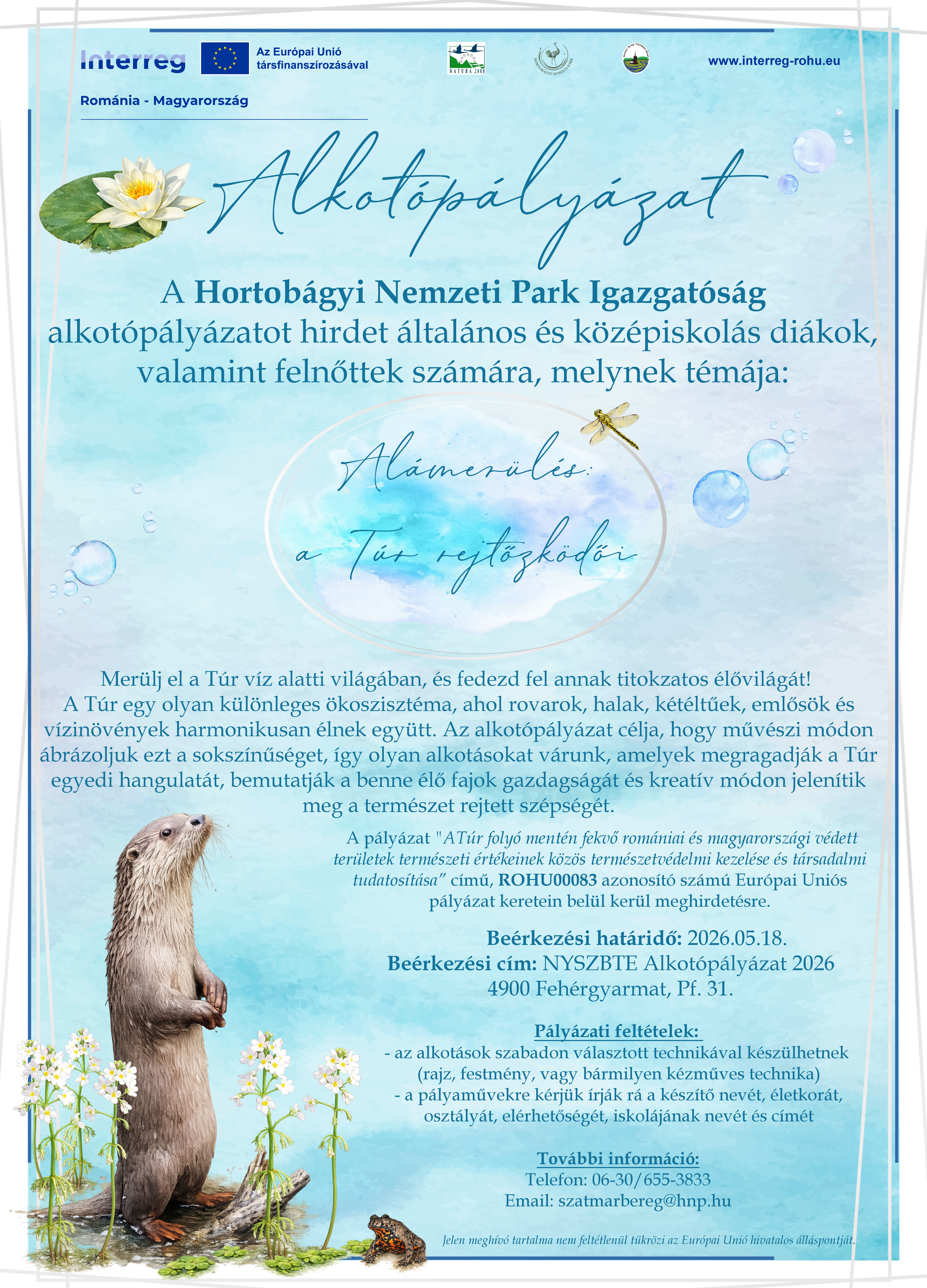 A Hortobágyi Nemzeti Park Igazgatóság Nyírség-Szatmár-Bereg Tájegysége alkotópályázatot hirdet, melynek témája: „Alámerülés – a Túr rejtőzködői”.