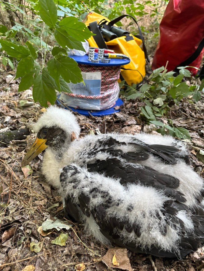 Alpinista eszközök és egy fekete gólya fióka