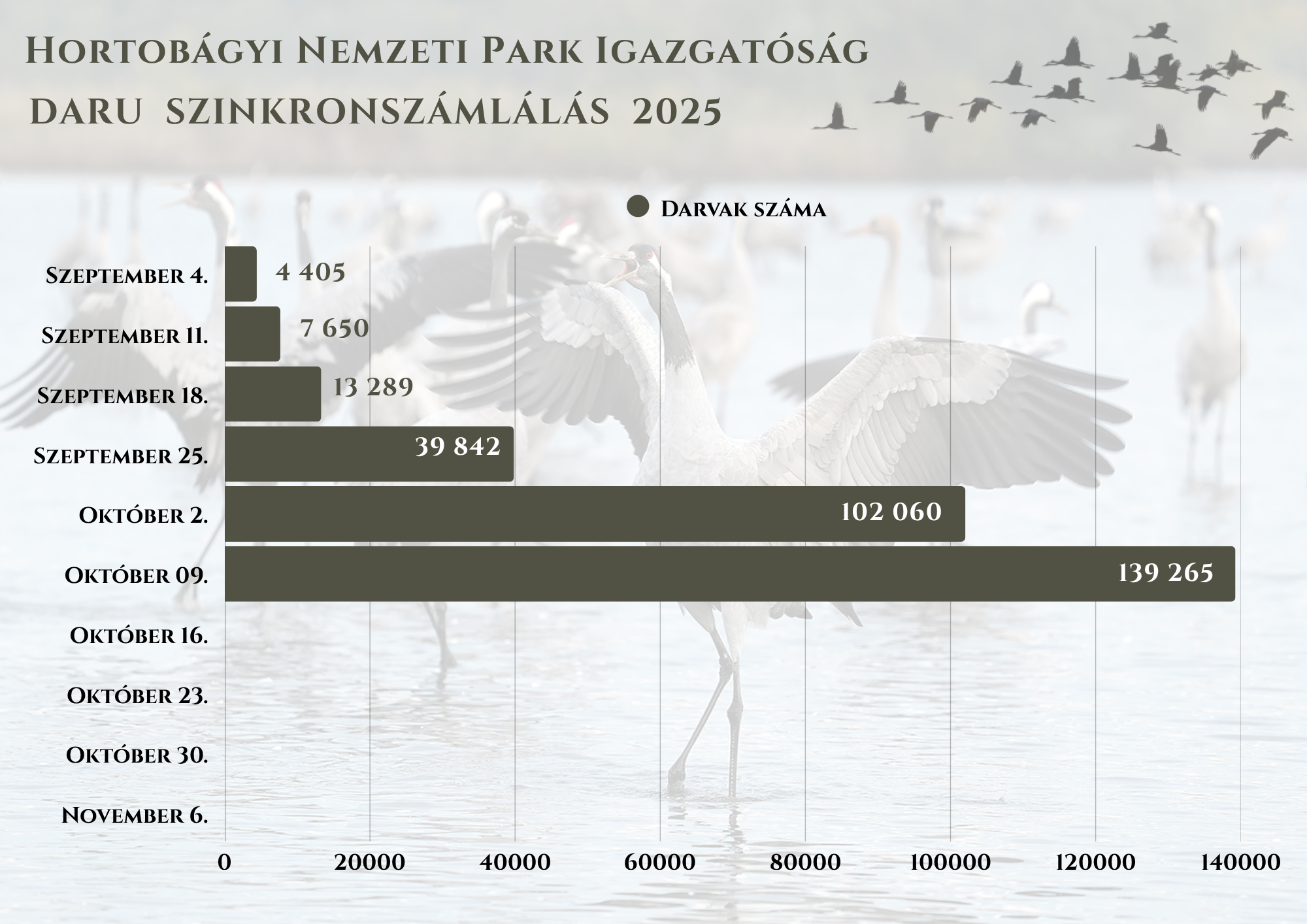 Szeptember hónap első felében a nyugodt, szélcsendes időjárás nem kedvezett a faj északi költőterületeiről történő dinamikus vonulás megindulásának, így a térségben tartózkodó madarak egyedszáma ebben az időszakban csak lassan gyarapodott. A szeptember 25-én végzett szinkronfelmérés során már érzékelhető volt a darvak létszámának jelentős emelkedése, azonban a csapatok tömeges beözönlése a 09.25-éről 09.26-ra virradó éjszaka, tehát a szinkronnapot követően ment végbe. A legutóbbi szinkronnap során a faj által az idei őszi időszakban használt, 20 elkülöníthető éjszakázóhelyen összesen már közel 140 ezer egyedet regisztráltunk a Hortobágyi Nemzeti Park Igazgatóság működési területén!
