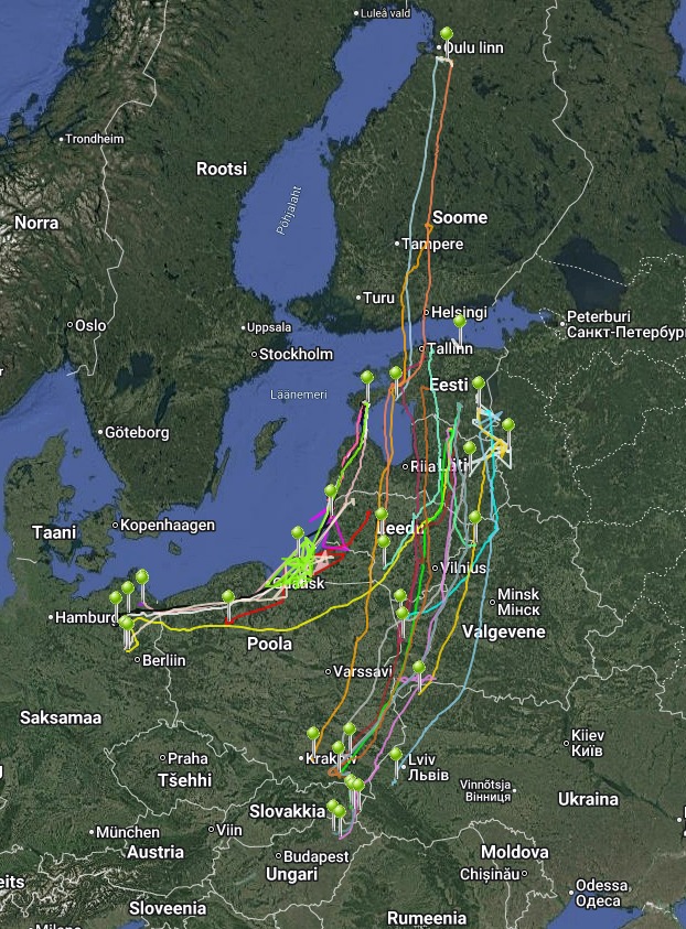 A hortobágyi régióban szeptember második felében megfigyelt vonulási mintázatot jól szemléltetik a Finnországban és Észtországban műholdas jeladóval ellátott daruegyedek mozgásadatai. Szeptember 23-án és 24-én a Skandináv-Balti térségben jelentős hidegbetörés, valamint a faj vonulását segítő szélirány alakult ki. A jeladós egyedek többsége ekkor kezdte meg vándorútját az északi területekről; az első példányok 24-én érték el a Kárpátok vonulatait, illetve 25-én éjszaka a Hortobágy térségét. (Lásd 1. kép). A vonulás mind időben, mind térben rendkívül dinamikusnak bizonyult. A kép ugyancsak jól szemlélteti az ottani darupopulációk vonulási stratégiáját: az állomány egy része nyugati irányba vonul, az ún. „atlanti” vonulási útvonalat használva, míg a populáció másik része déli irányba halad, az ún. „balti–magyar” vonulási útvonalat követve éri el a Kárpát-medencét, majd a telelőterületeket.