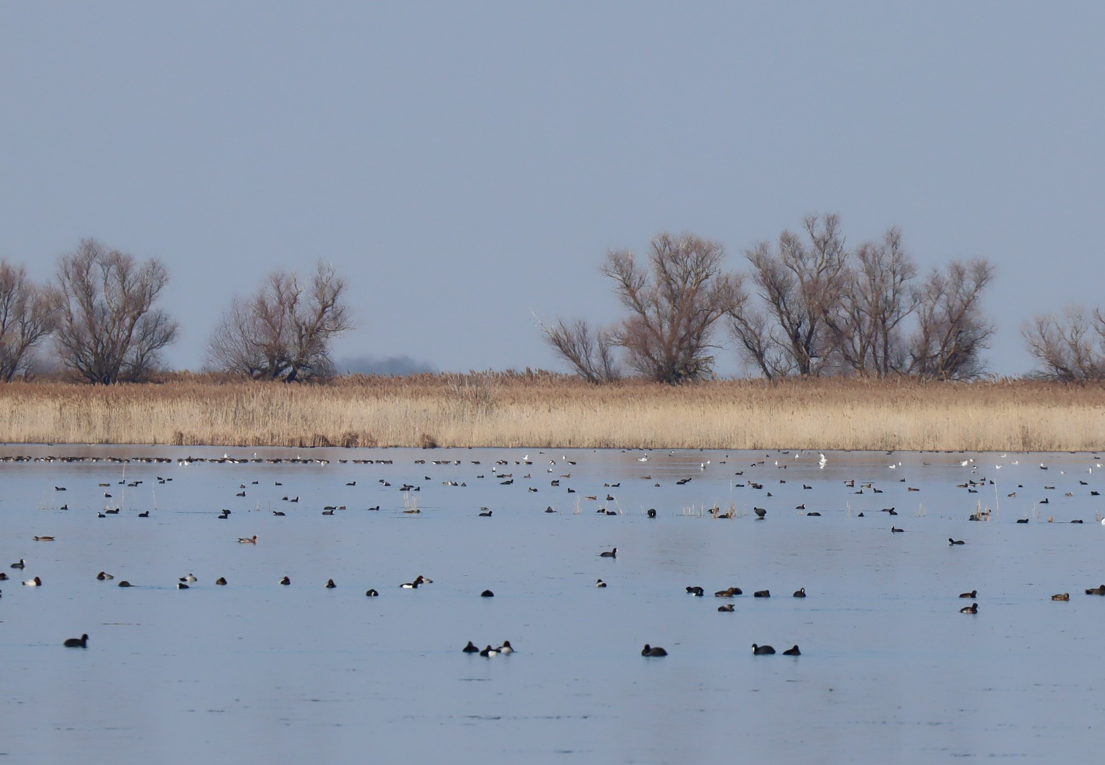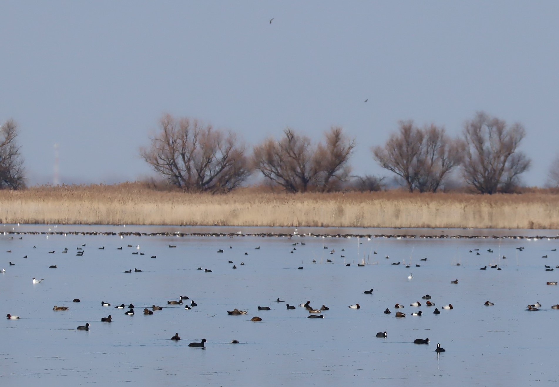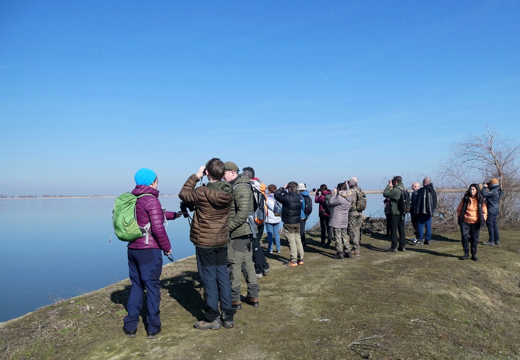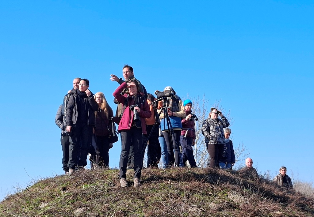 Egy közeli kilátódomb tetejéről jól beláthattuk az un. „Bivalyos-tó” madarait. Többek között a nemrég érkezett bíbiceket (Vanellus vanellus), kanalas récéket (Spatula clypeata) vagy éppen az elegáns nyílfarkú récéket (Anas acuta) vettük szemügyre távcsöveinkkel, miközben persze fél szemmel az eget figyeltük.