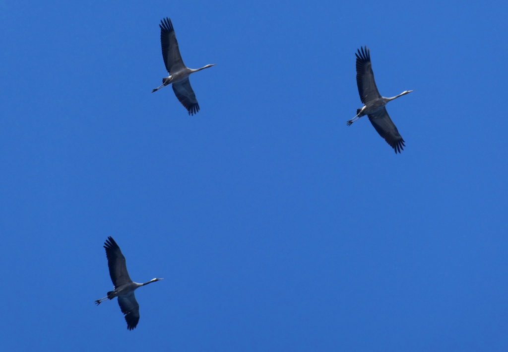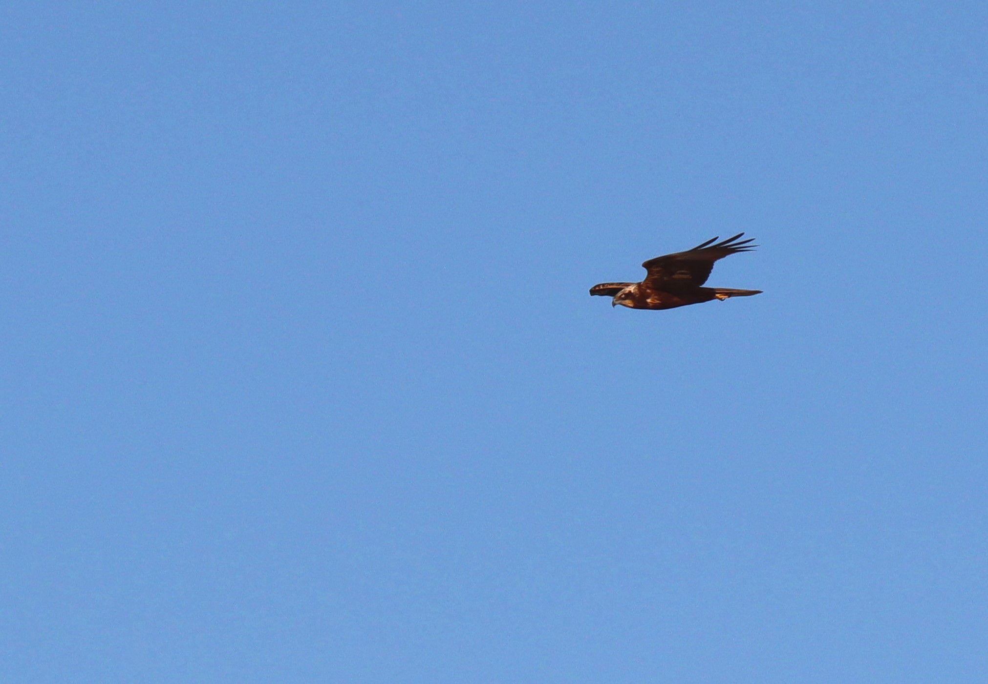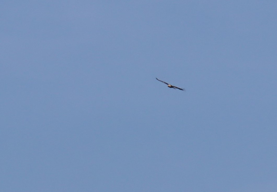 A kellemes, napos időben egyre-másra jelentek meg a ragadozók is. Barna rétihéja (Circus aeruginosus), vörös vércse (Falco tinnunculus), egerészölyv (Buteo buteo) mutatta magát, majd felbukkant az első rétisas (Haliaeetus albicilla) is. Öreg példány volt, az egyik tóparti fa tetején üldögélt, spektíven keresztül jól látszottak jellegzetes bélyegei. Nemsokra rá már összesen öt, a magasban keringő rétisast számoltunk meg. Fejünk felett darvak (Grus grus) húztak át, mialatt kedvünkre tanulmányozhattuk a változatos halastavi, tavaszi madártömeget.