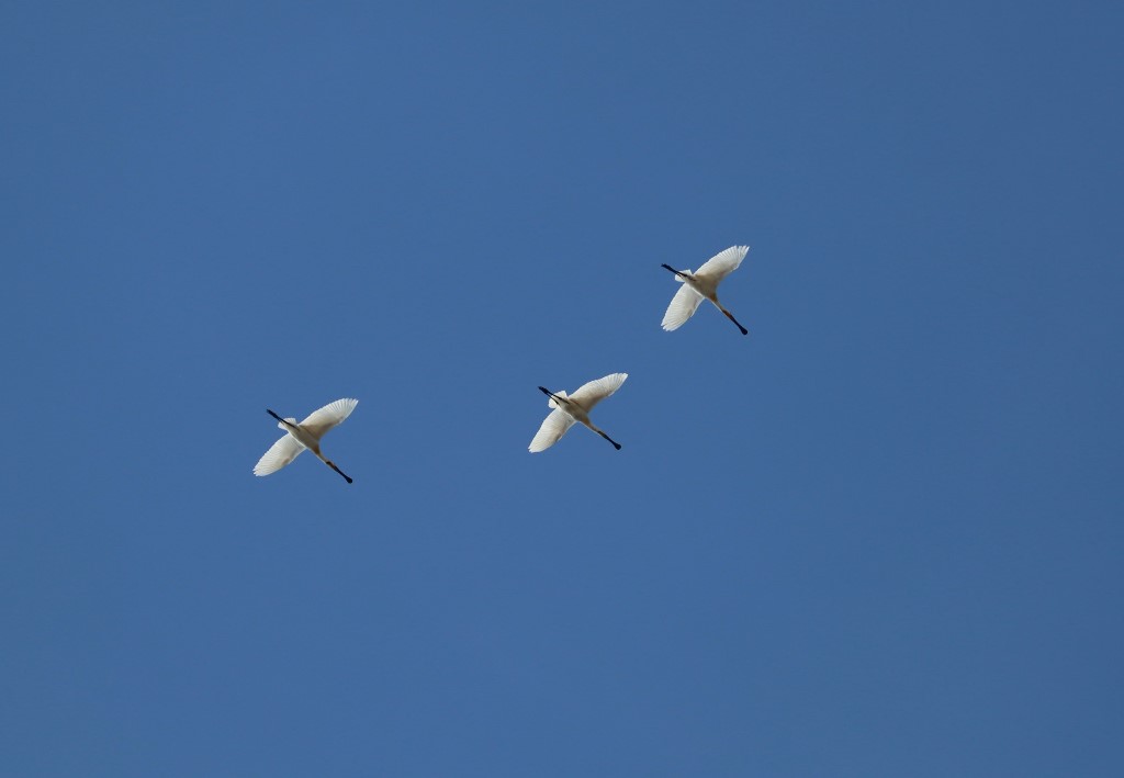 A tanösvény magasleseiről jobban belátva a tájat megfigyelhettük idei első kanalasgémeinket (Platalea leucorodia), libacsapatokat, barkóscinegéket (Panurus biarmicus). Nem messze feketerigó (Tudus merula) keresgélt, a magasban dankasirályok (Larus ridibundus) köröztek, a nádas felett barna rétihéja vadászgatott, sőt egy pézsmapockot (Ondatra zibethicus) is sikerült szemügyre vennünk.