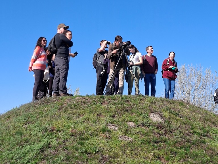 Túra előtti tájékoztató és madárles a dombon, a séta első állomásán