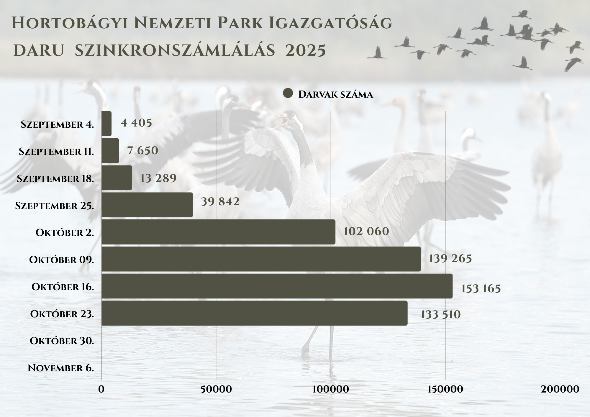 Az itt tartózkodó darvak létszámát hetente mérik a Hortobágyi Nemzeti Park Természetvédelmi Őrszolgálatának szervezésében. Az ún. szinkronszámláláskor a darvak éjszakázóhelyeként szolgáló sekély vízállásoknál, halastavaknál felsorakozó megfigyelők a látóhatárt egymást között felosztják, így a különböző behúzási útvonalakon érkező csapatok létszámát jó közelítéssel meg tudják becsülni.