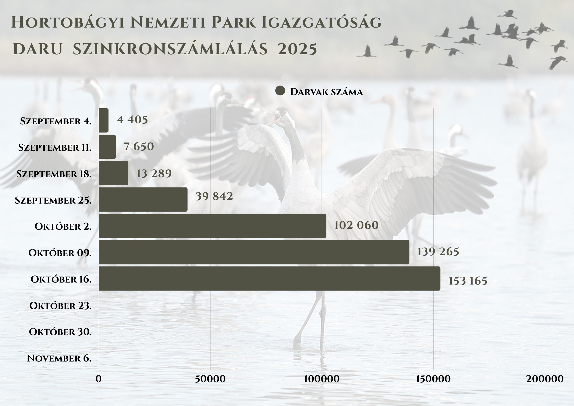 Az itt tartózkodó darvak létszámát hetente mérik a Hortobágyi Nemzeti Park Természetvédelmi Őrszolgálatának szervezésében. Az ún. szinkronszámláláskor a darvak éjszakázóhelyeként szolgáló sekély vízállásoknál, halastavaknál felsorakozó megfigyelők a látóhatárt egymást között felosztják, így a különböző behúzási útvonalakon érkező csapatok létszámát jó közelítéssel meg tudják becsülni.